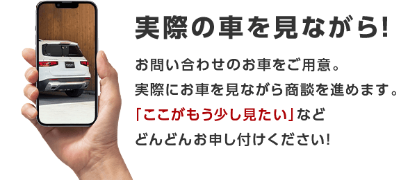 ご自宅などお好きな場所から、スマートフォンのLINEビデオ通話を使って、店舗スタッフに中古車のご相談や、実際の車両状態の確認ができる無料のサービスです。ご来店いただくことなく、気になるクルマの詳細をリアルタイムの映像でご確認いただけます。サービスのご利用は無料ですが、通信料はお客様のご負担となります。