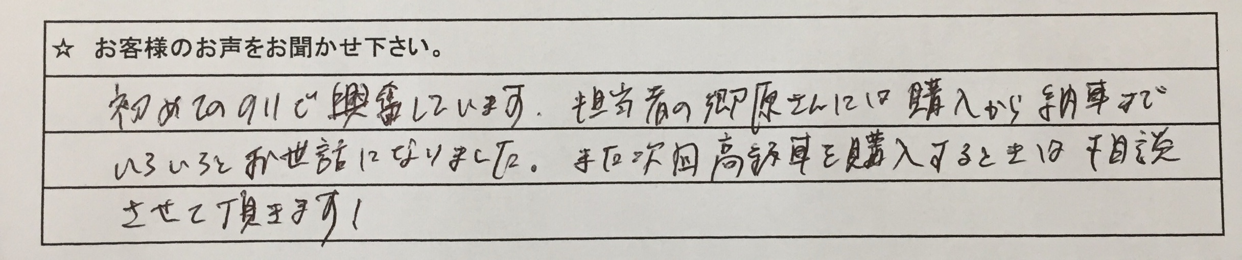 この度は当店の911カレラSを購入頂き、誠にありがとうございます。スポーツクロノ、スポーツエキゾーストという定番人気オプションだけでなく、オールレザーインテリア、ACC、PCCBまで装備充実した一台で、非常に問い合わせ多数でしたが、ご縁あってご注文頂きました。車だけではなく、仕事のこと、人生設計の話など様々なお話しをさせて頂きましたが、是非今後とも末永くお付き合い頂ければ幸いです。今後ともよろしくお願いいたします。