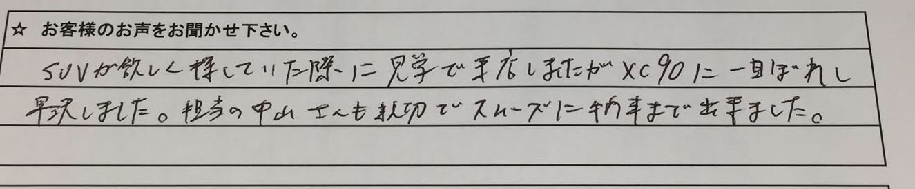 納車情報 2016年式 ボルボ XC90 T8ツインエンジン インスクリプション 千葉県 O様 COMMENTお客様の声 MESSAGE担当スタッフからのメッセージ この度は当店のXC90を購入頂きまして誠にありがとうございます。「カッコイイSUVを探している」と立ち寄られて、XC90との一目惚れでの出会いは正にご縁だったと思います。これからご家族皆さんで楽しんで頂くカッコイイ愛車としてご利用して頂ければと思います。この度はありがとうございました。今後ともよろしくお願いいたします。 PREVNEXT一覧に戻る